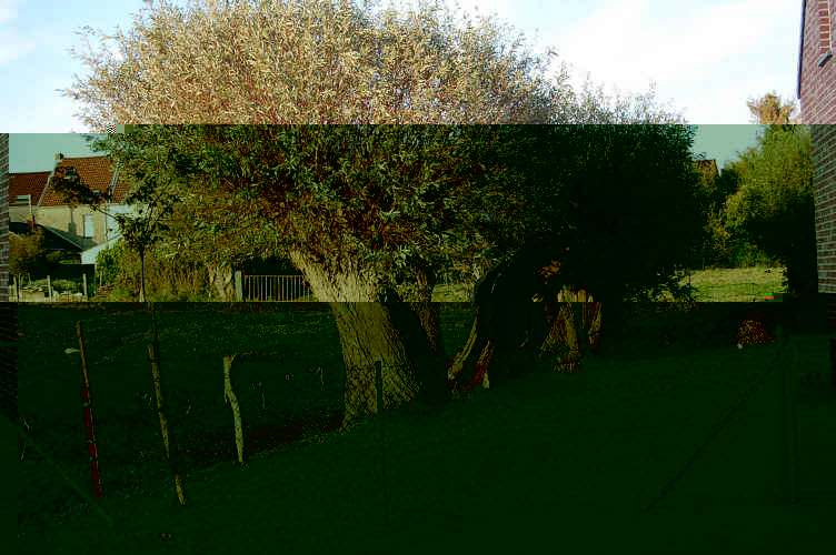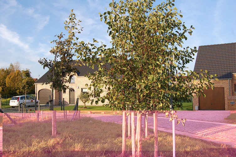 Gros plan sur une autre noue, aussi entretenue par la Commune. Pas joli-joli. Faudrait des buissons pour cacher tout ça. Plantations d'Imwo sur une sorte de placette. Comme la Commune n'est pas dégourdie, ce sont les riverains qui tondent l'herbe 2-3 fois l'été. Les anciens saules tétards (en flamand "de sooltetaars") ont été conservés et intégrés sur les parcelles individuelles. Un riverain nous a montré qu'il avait fait une taille assez sévère, qu'Imwo est venue contrôler pour voir si la vie de l'arbre n'était pas menacée. Petit fossé. Très petit. A toujours existé, du temps où tout ça n'était que pâtures. Entretien à charge des riverains, qui ne s'en tracassent pas. 'Faut juste tondre un peu les berges une ou deux fois par an. Pareil. Juste pour montrer le manque d'unité: à gauche, allées en dolomie (rares, ici) A droite, allées en grenailles de pierre bleue, et plus loin, pelouses uniquement. Petits chemins piétonniers un peu partout. Chouette pour les gosses. Ca j'aime bien. Ces gens ont juste mis un cordeau pour montrer aux gosses où commence leur propriété. Tu peux passer, mais reste sur le chemin. Et pas de clôture... OK, mais 'faut rien laisser traîner dans le jardin. A l'horizon, grande surface qui fait l'objet d'une deuxième phase de lotissement, et qui va commencer sous peu. Je parie qu'EVR et Dr D. auraient déjà lancé les signatures de compromis s'ils habitaient ici. Ca, c'est pour finir. Voici la maison de JR Ewing. (Ou de Travolta ?). J'ai cherché les cornes de taureau sur le capot de la BMW, d'ailleurs. Ouais, bon, si ils aiment... A côté, c'est de la Terca Rouge Espagnol pas encore rejointoyée, et du bardage de cèdre, "oublié" dans nos prescriptions. De façon générale, les hauteurs sous corniche sont plus limitées qu'à Gembloux. Impressions générales sur le lotissement :