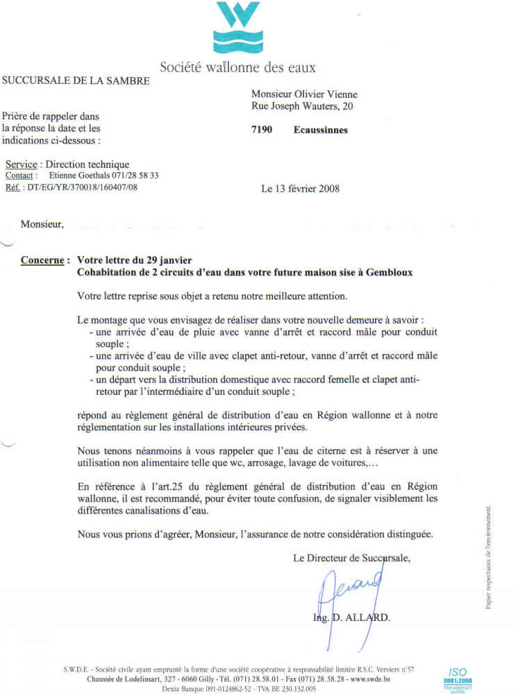 J'ai un jour écrit à la SWDE pour savoir clairement ce qui était autorisé et ce qui ne l'était pas en matière de raccordement d'eau de pluie. Plein de rumeurs circulent à ce sujet.