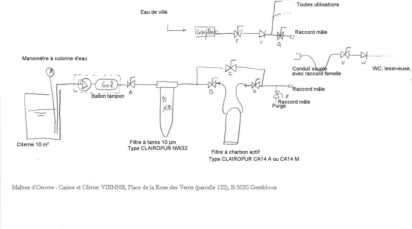 Pour la partie "Eau de ville", venant du compteur, on a une vanne d'arrêt F et un anti-retour V (obligatoires), puis les différentes utilisations de l'eau de ville et la possibilité de connecter par le tuyau souple les différentes utilisations normalement alimentées par l'eau de pluie, au cas où la citerne serait vide.